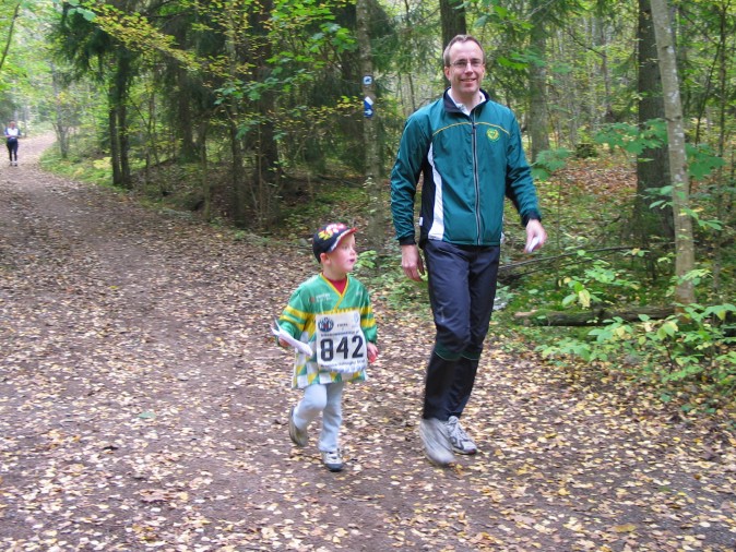 Olle springer längs en stig.
